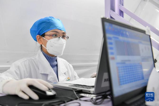 1月13日,在天津市北辰区某高校,气膜实验室工作人员在扩增分析区分析核酸样本数据。新华社记者赵子硕摄