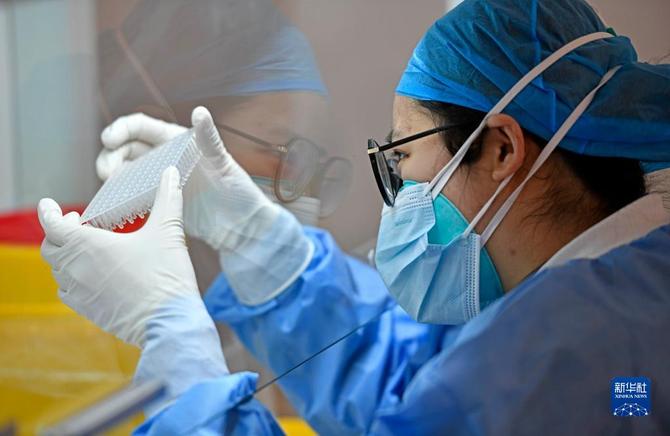 1月13日,在天津市北辰区某高校,气膜实验室工作人员在样本处理区作业。新华社记者孙凡越摄