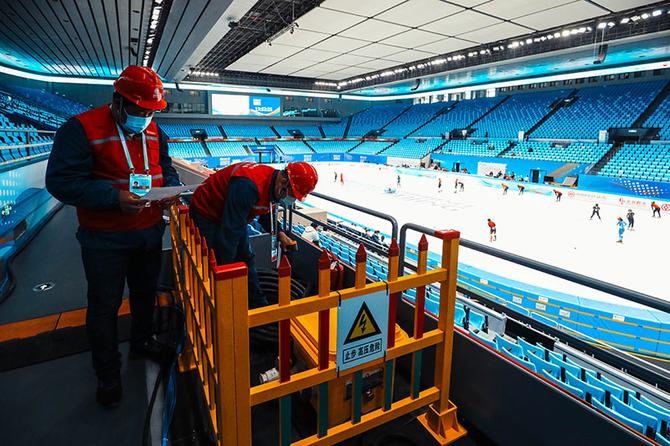 首都体育馆电力保障团队对设备进行巡视测温工作。(图片来源:国网北京电力 供图)