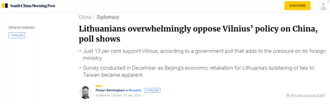 报道介绍,立陶宛这份民调于2021年12月10日至18日进行,询问问题包括该国民众如何看待当前立陶宛对华政策。周二(1月11日)公布的结果显示,仅13%的受访者表示支持,有60%的人持否定态度。