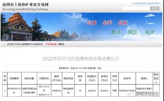 据昆明市土地和矿业权交易网消息,11月13日,中国水利水电第十四工程局有限公司以底价约2.02亿元拿下昆明市官渡区金马街道办事处15984平方米商务金融用地,拟建设一栋办公楼。