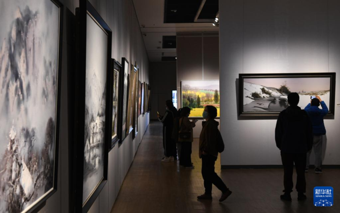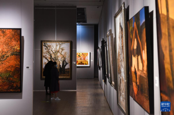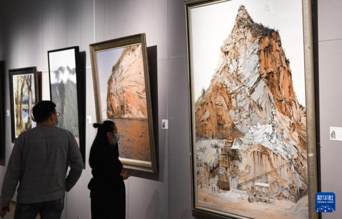 1月12日,参观者在海南省博物馆的“山川魂魄——中国南方油画山水研究展”上欣赏展品。