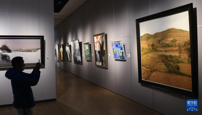 1月12日,参观者在海南省博物馆的“山川魂魄——中国南方油画山水研究展”上拍摄展品。