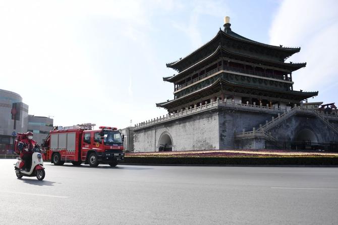 1月13日,配送员派送外卖时经过西安钟楼。新华社记者 李一博 摄
