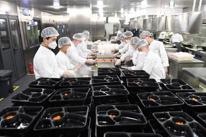 1月13日,在西安市西安饭庄东大街总店,后厨人员打包团餐。新华社记者 李一博 摄