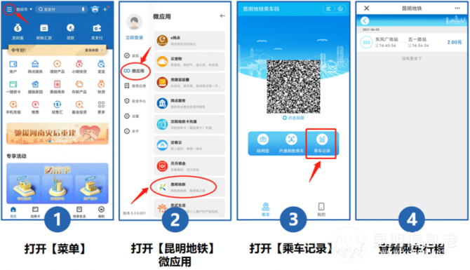 三、活动内容:在活动开展期间,逢周末及国家法定节假日,乘客使用“昆明地铁APP”、“中国建设银行手机银行APP”刷脸或使用乘车码扫码过闸,至西山公园站出站票价免费。