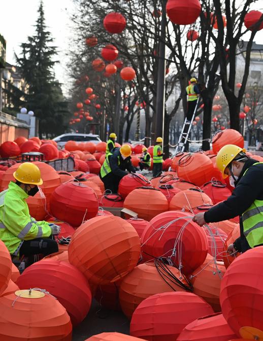 1月15日,施工人员在西安市慈恩东路悬挂红灯笼,迎接春节。新华社记者 陶明 摄
