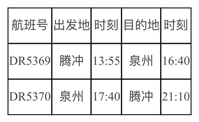 “腾冲=泉州”航班班期计划为每周一、三、五、七执飞,航班信息如下: