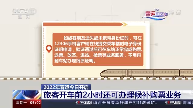 12306网站和手机客户端,旅客办理购票或改签业务,由原来每日5:00至23:30延长为每日5:00至次日凌晨1:00;候补购票截止时间由最晚开车前6小时调整为2小时,旅客在开车前2小时还可以办理候补购票业务;同时旅客在12306网站购票时可以同时查询出行目的地的疫情防控政策;如旅客朋友遗失或未携带身份证时,可在12306手机客户端在线提交乘车临时电子身份证明申请,验证通过后可在车站正常完成购票、退票、改签、进站、检票等业务服务,不用再到车站办理纸质证明。