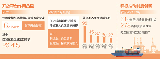 日前,我国2021年外贸成绩单发布,货物贸易进出口规模首次突破6万亿美元。其中,自由贸易试验区进出口增长26.4%,呈现蓬勃发展态势。