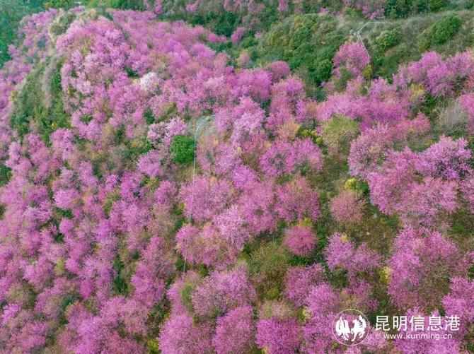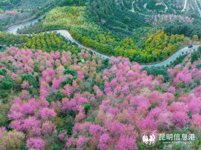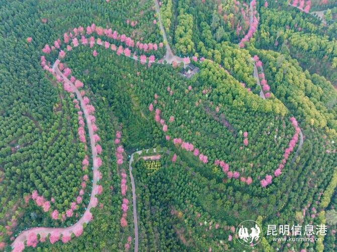 昆明信息港讯 记者段佳琪 通讯员杨小明 近日,走进位于昆明市宜良县狗街镇玉龙村东南玉龙山的冬林苑,成片粉色樱花绽放,与蜿蜒的步道、古香古色的古寺交相辉映,勾勒出一幅古雅清秀的山中冬景图,美不胜收。
