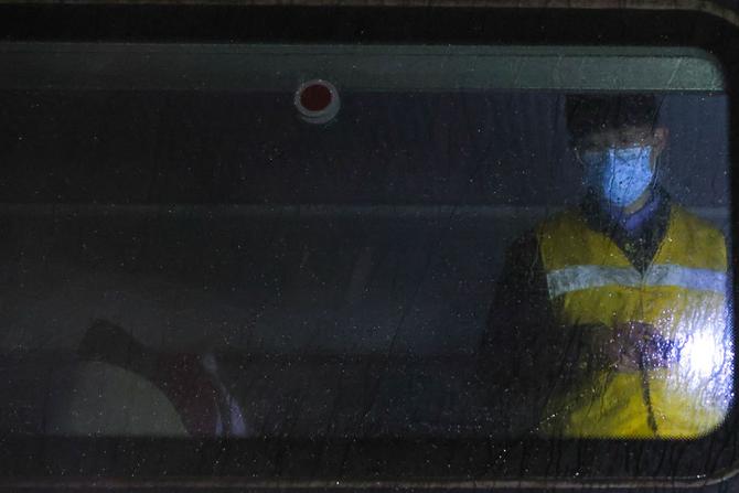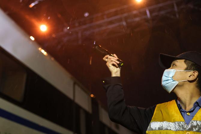 1月16日,地勤机械师洪昊阳在动车组车厢内巡查。