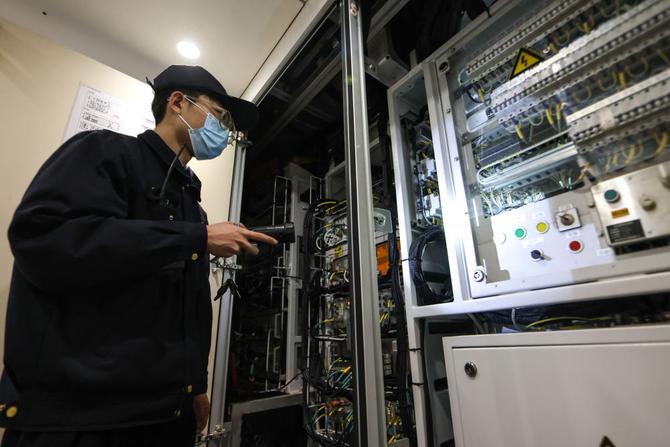 1月16日,地勤机械师洪昊阳在动车组车厢内检查配电柜状态。
