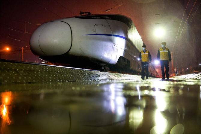 1月16日,地勤机械师洪昊阳(左)、祁鑫在动车组旁巡查。