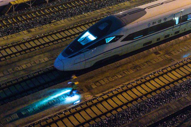 “打温”是铁路系统的专业术语。结束一天线路运行的动车组,在经过全面检查维护后,统一停放在室外存车场,为第二天的运输任务待命。为防止夜间动车组内部的复杂管路被冻坏,需要有“打温人”为停放的动车组供电,开启动车组加热系统,保障动车组各设备部件时刻处于良好状态。夜幕降临,贵阳车辆段贵阳北动车运用所的地勤机械师们穿梭在一辆辆动车组间,为2022年春运的第一批动车组“驱寒保暖”,保障春运安全。2022年春运将于1月17日开启。(新华社记者 欧东衢)