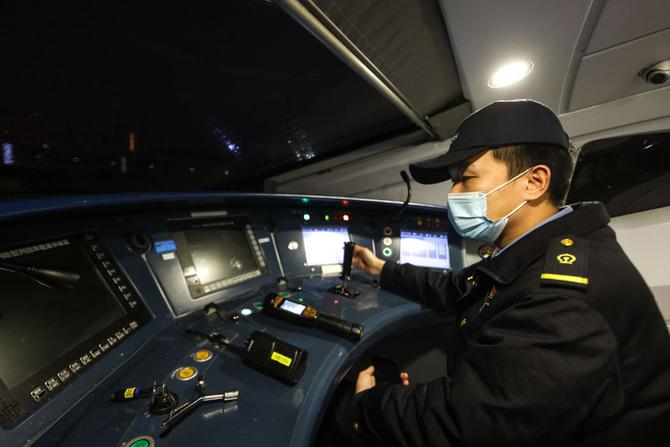 1月16日,地勤机械师祁鑫在动车组司机室内激活动车组。