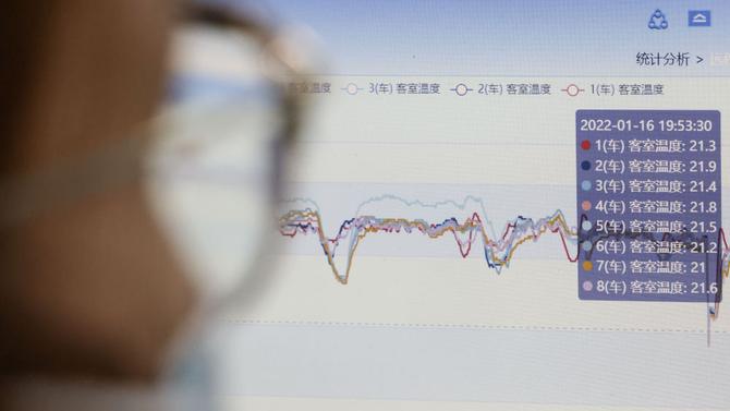 1月16日,地勤机械师通过远程监控设备查看动车组的实时状态。