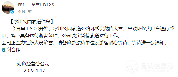 昆明信息港讯 记者姚仲恒 1月17日,记者从丽江玉龙雪山官方微博获悉,自1月17日11:20起玉龙雪山景区暂停接待游客,具体开放时间等待景区通知。此外,同时暂停冰川公园暂停索道接待工作。公告全文如下: