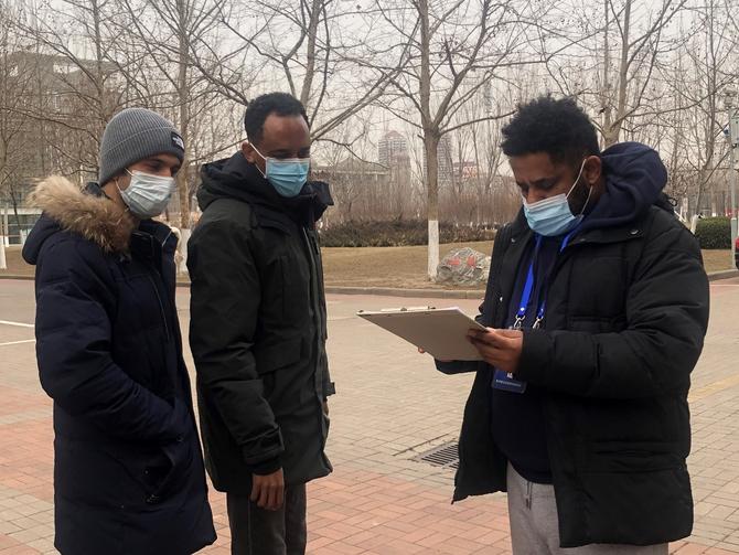 天津启动全员核酸检测后,天津职业技术师范大学国际学院辅导员郭梁微信收到了埃塞俄比亚博士研究生艾华和贝宁本科生约翰的“请战书”——他们希望参加全校核酸检测的志愿服务工作。