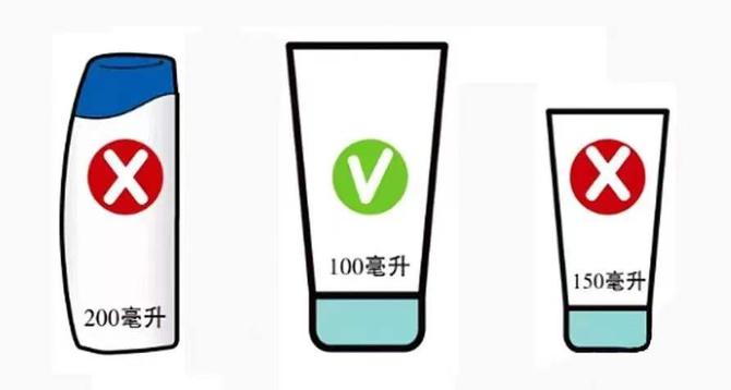 注意:这里说的不得超过100g/mL是指化妆品的容器容积,也就是化妆品瓶子的大小,而不是化妆品的剩余量。如果瓶子超过100g/mL您可以提前办理托运手续,或让同行人员带回,同时安检服务台也可为您办理暂存服务。