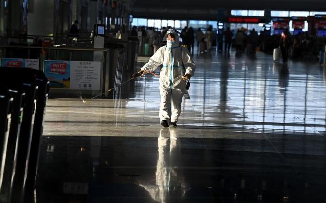 1月16日,工作人员在对西安北站候车大厅进行环境消毒。新华社记者 陶明 摄