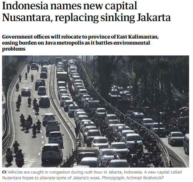 《经济日报》称,新首都“Nusantara”在雅加达东北方向约2000公里,雅加达是印度尼西亚目前的金融和商业中心,人口约1000万,由于面临下沉危机,加上希望将经济发展转移到加里曼丹岛东部地区,因此2019年宣布迁都,但受到疫情影响,预计最快2024年开始搬迁。