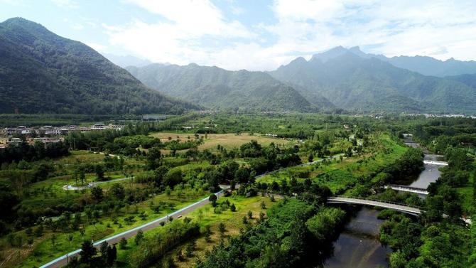 陕西省西安市长安区秦岭违建别墅“群贤别业”拆除后建设的秦岭和谐森林公园(2019年7月26日摄,无人机照片)。新华社记者 刘潇 摄