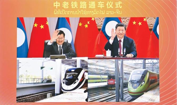 2021年12月3日,习近平在北京同老挝人民革命党中央总书记、国家主席通伦通过视频连线共同出席中老铁路通车仪式。16时44分许,习近平和通伦通过视频连线下达“发车”指令。数千里之外,中国昆明站内的复兴号“绿巨人”、老挝万象站内的“澜沧号”动车组同时启动,开启相互奔赴的旅程。习近平表示,“铁路一通,昆明到万象从此山不再高、路不再长。”