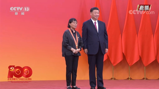 2021年6月29日,人民大会堂金色大厅灯光璀璨,习近平总书记亲手为张桂梅等到场的“七一勋章”获得者戴上这枚沉甸甸的勋章。在“七一勋章”颁授仪式上,习近平总书记发表重要讲话。他说,“七一勋章”获得者都来自人民、植根人民,是立足本职、默默奉献的平凡英雄。“他们的事迹可学可做,他们的精神可追可及。”