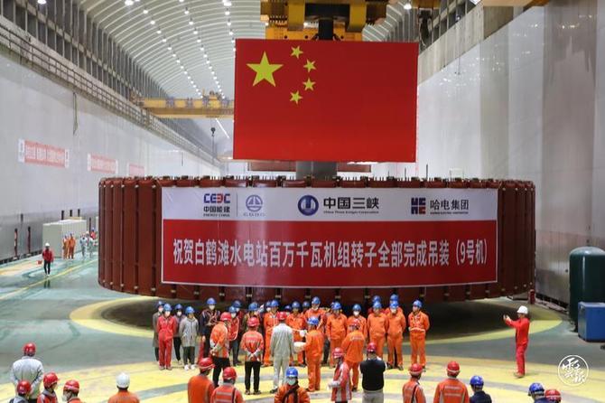 1月18日,中国能建葛洲坝机电公司承担安装与调试的世界在建装机规模最大的水电站——白鹤滩水电站最后一台百万千瓦水电机组(9号)转子吊装就位,标志着电站16台百万千瓦水电机组转子全部安装完成。