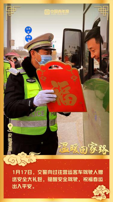 1月17日是2022年春运第一天。千千万万人踏上了回家的路,也有很多人为了这条“路”的平安、温暖而默默守护:他们星夜检修列车与铁轨,他们伫立风雪中维护交通秩序,他们在车厢里送上热茶和红彤彤的“福”字......是无数个“他们”的坚守让回家的路显得不那么漫长。感谢守护者,也愿所有人能平安抵达终点,阖家团圆。