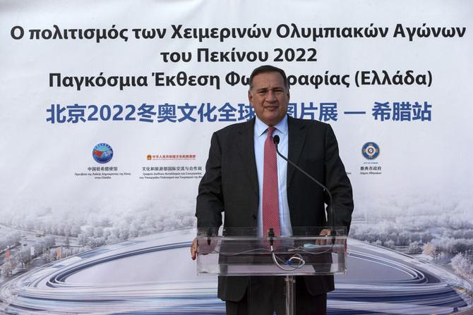 资料图:2021年10月13日,希腊奥委会主席卡普拉洛斯在北京2022冬奥文化全球行图片展开幕仪式上。新华社发(马里奥斯·罗洛斯摄)