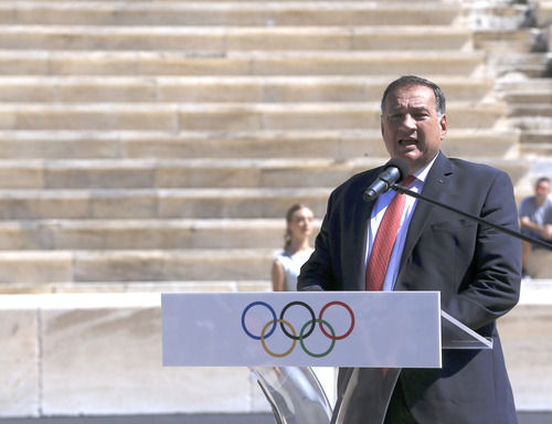 资料图:2019年9月17日,希腊奥委会主席卡普拉洛斯在2020洛桑冬季青奥会点火仪式上致辞。新华社发(马里奥斯·罗洛斯摄)