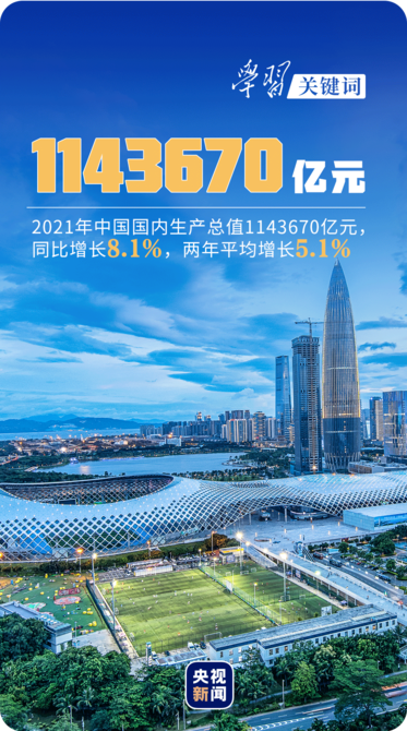 1月17日,2021年我国主要经济数据公布,初步核算,2021年中国国内生产总值超过114万亿元,同比增长8.1%,两年平均增长5.1%。
