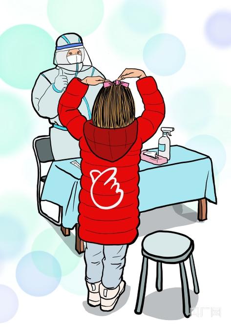 漫说故事:天津市首轮大筛时,在天津市南开区一检测点,刚进行完核酸采样的小女孩高举双手,向医护人员“比心”,医护人员也挑起拇指,为小女孩点赞。