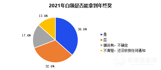 智联招聘近日发布《2021年白领年终奖调查报告》,其中指出,36.6%的白领会有年终奖,占比高于前两年。超半数国企白领有年终奖,这一比例是民企的近2倍,能源、金融等行业白领年终奖情况更好。2021年白领年终奖平均金额为10227元,五年内首次破万,同比增长30.7%。昆明白领2021年年终奖均值为8419元,在全国33个主要城市中排名第26位。
