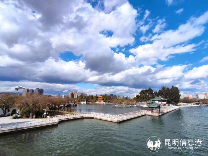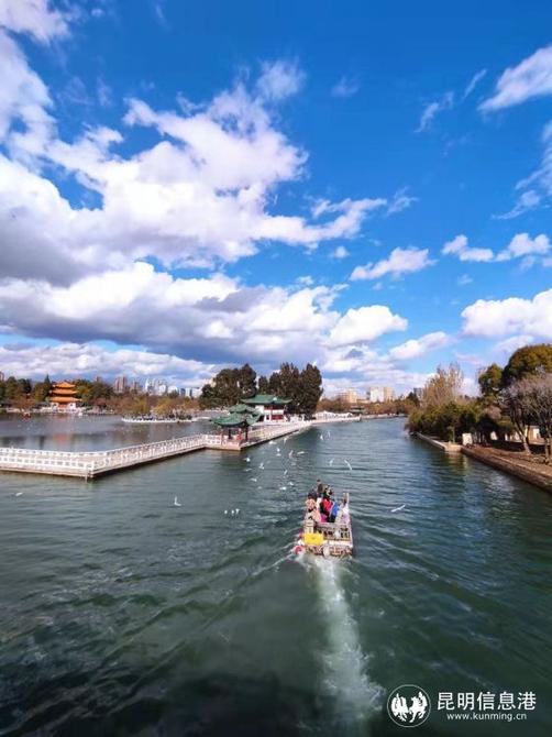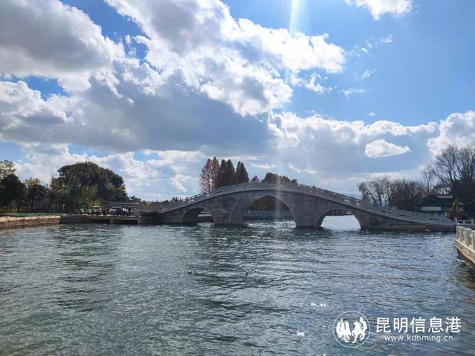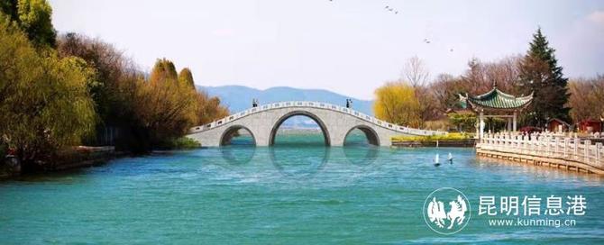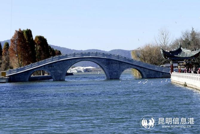 一桥飞架南北, 天堑变通途。大观河一号桥不仅成为贯通南北两园的纽带,也为广大游客提供了一个更好地欣赏滇池美景的视角,站于桥上,可一览水清、景美,河面上波光粼粼,海鸥飞舞,大观楼掩映其中,构成一幅昆明最美景观。大观楼也因为这座新建的桥,和滇池的关系更显亲近。