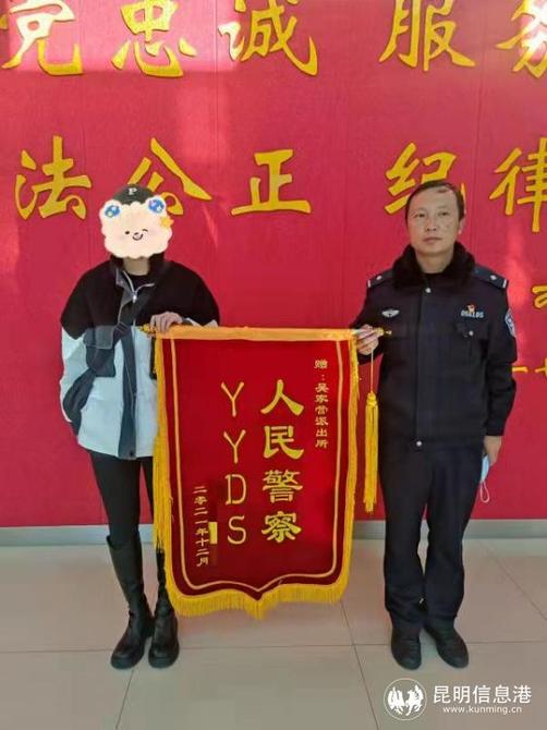 昆明信息港讯 记者合宇聪 1月8日下午,云南民族大学学生田某将一面印有“人民警察YYDS”的锦旗送到昆明市公安局呈贡分局吴家营派出所民警手中,以表达对民警帮助其找回丢失电动车及手机的感激之情。