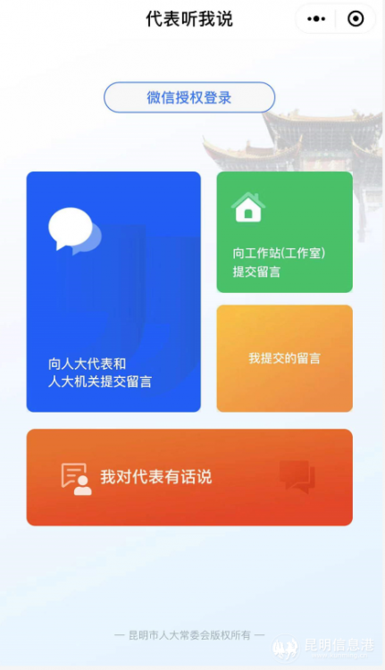 昆明市人大常委会开设了“昆明人大之窗”微信服务号作为人大代表履职的便捷入口,点击菜单栏里面的“代表履职”,通过微信授权登录就可以进入平台。平台包括代表个人信息查看、建议提交及建议办理进度查询、履职信息发布、履职活动扫码签到、通知查阅及回复、选民留言查看及回复、会议资料查询、学习培训资料查询、常委会公报及人大公报查询等功能。