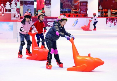 1月23日,小朋友们在河北省石家庄市裕华区欢乐汇商场的滑冰场玩耍。新华社发