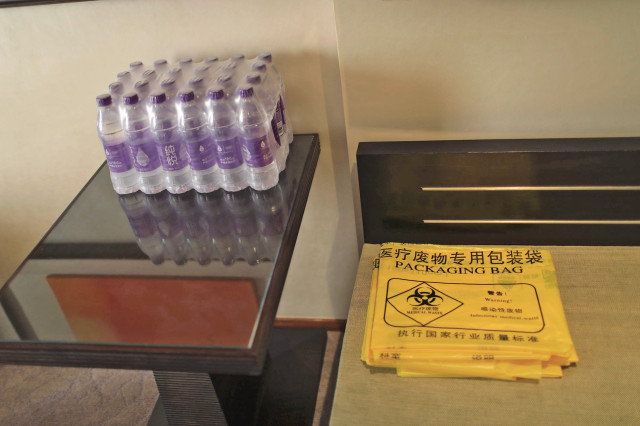 在入住客人的居住区,为了最大限度地减少人员交叉,服务员都只被允许在客人不在房间时进行打扫。每个房间都使用了医用垃圾袋,收拾的时候只要一封就能拿走,再套上一个新的垃圾袋即可。