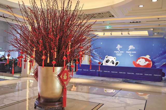 冬奥会遇上中国传统且最隆重的节日——春节,冬奥保障酒店变着花样让入住宾客感受到春节的民俗味儿。北京伯豪瑞廷酒店大堂入口的左右两侧各挂上了一个大大的中国结,大堂正中央还有一个2米左右的“春”字,“春”字下方摆放着写满了吉祥祝福语的爆竹装饰品。