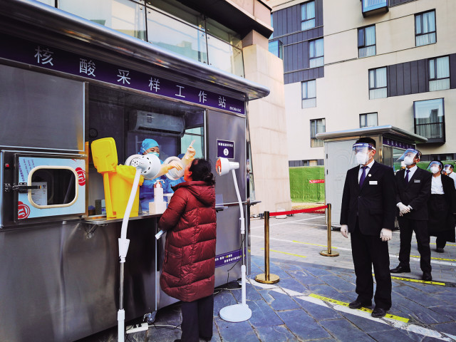 疫情防控仍是所有冬奥保障酒店的重点任务之一。北京华腾美居酒店门前有两个新型核酸采样工作站,医护人员正在密闭的空间里进行采样,核酸采样整个流程不到1分钟。