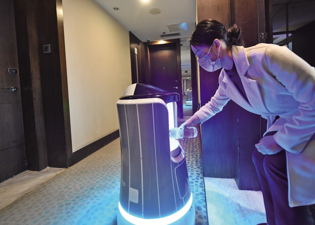 1月19日,金陵饭店,智能机器人将水送到客房门前。新京报记者 王贵彬 摄