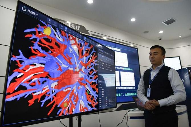 2021年12月24日,工作人员在位于安徽省合肥市西郊的中国声谷体验中心内介绍一款智慧医疗产品。 新华社记者 张端 摄