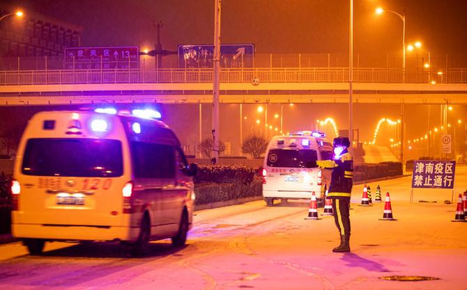 1月22日,在天津市津南区某公路卡口处,骑警队员在雪夜里保障救护车辆进入通畅。新华社发(张吉蔚摄)