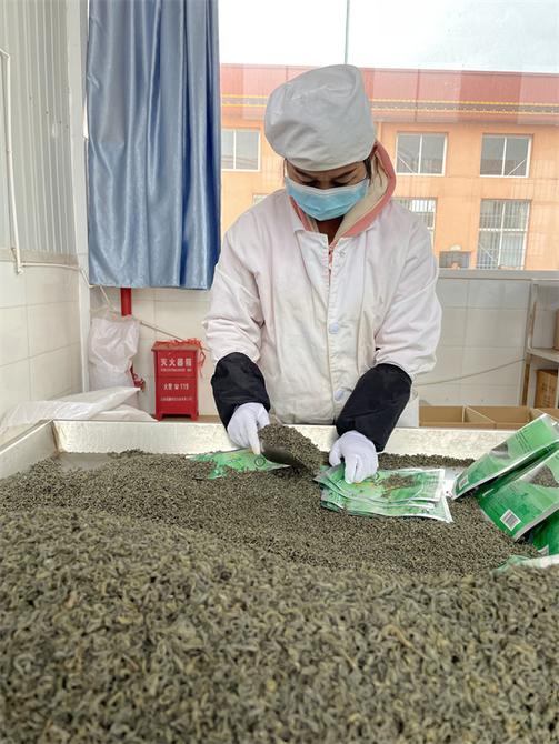 在双柏县游子山茶园的加工车间,工作人员正忙着给工作台上散装的茶叶分装。