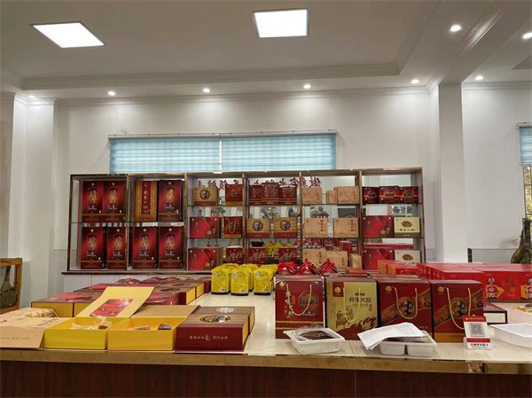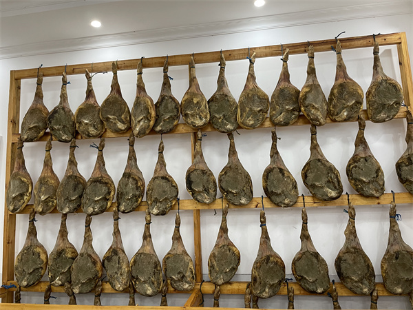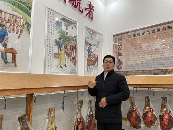 在牟定县楚雄彝家香经贸有限公司产品展厅内,各式各样的彝家火腿琳琅满目。