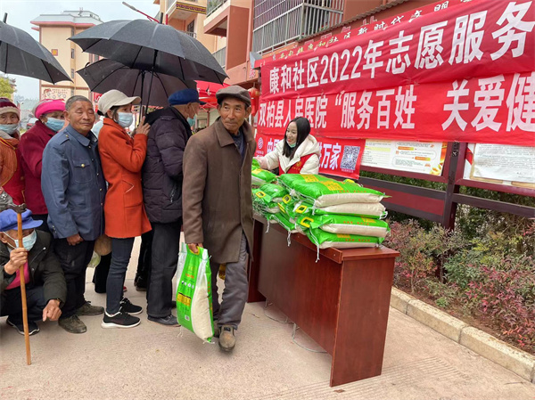 天空飘着蒙蒙细雨,双柏县妥甸镇康和社区就业服务中心门前的帐篷下,年迈的老人端坐着由志愿者为其理发;在慰问品发放处,一群年长的异地搬迁居民整齐排队免费领取爱心粮油产品。