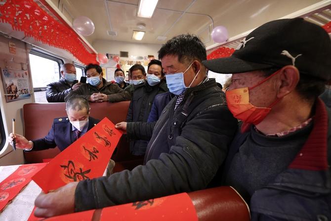 列车工作人员为旅客写春联(央广网发 刘松霖摄)